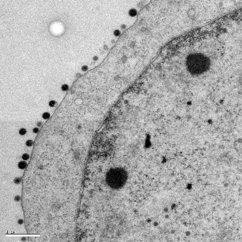 图片描述:诸多的病毒有的刚在细胞内部组装完成,有的已经释放到细胞表面,它们围绕着细胞膜表面,形成众星捧月之势。