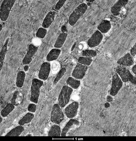 图片描述:肌丝束构成广阔的平原,其中平行分布着的线粒体就构成了一条条的道路……