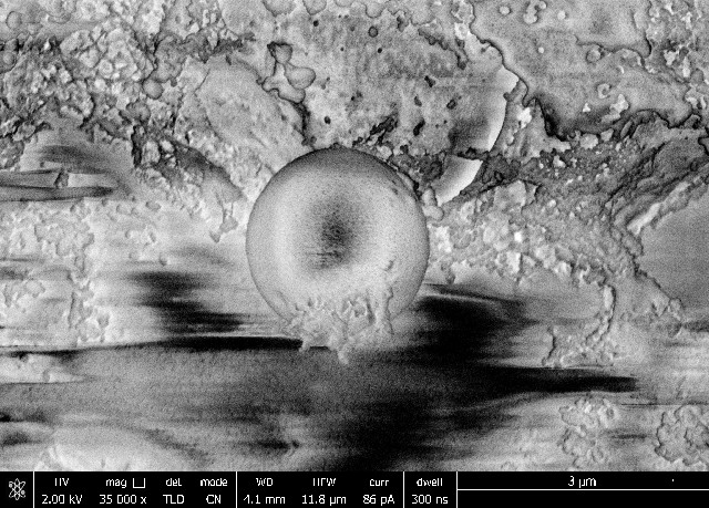 图片描述:本作品使用冷冻双束扫描电镜Helios拍摄牛奶样品,通过冷冻断裂和升华观察牛奶乳液颗粒,实现了35000倍放大成像。本图观察到了一颗直径约2微米的乳液颗粒,在拍摄过程中,颗粒下方的荷电效应形成了光晕一般的视觉效果,使得整幅图犹如一幅日出东方水墨画。