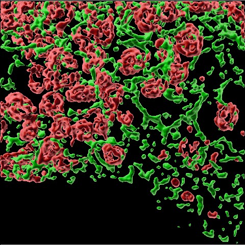 图片描述:cos7细胞中荧光标记的线粒体和内质网经药物处理后受损裂解,像一朵朵玫瑰花怒放在鲜嫩的绿叶中,一片绚烂。