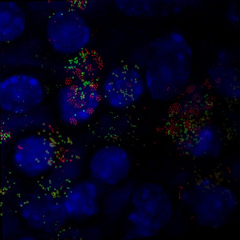 实验方法:贴壁生长的细胞通过红色荧光蛋白和绿色荧光蛋白分别标记了纤毛结构蛋白,DAPI染料标记细胞核内的染色质结构(蓝色),进行三色荧光显微成像。