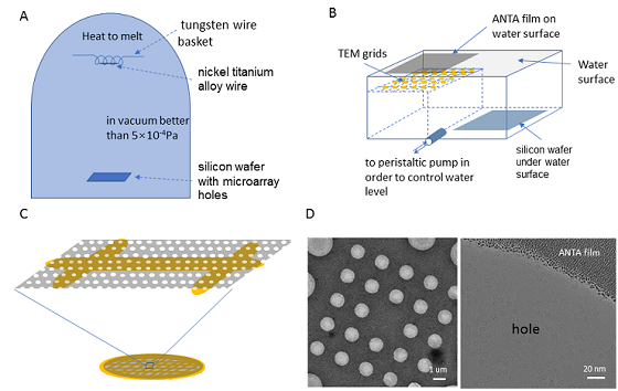 图1. 非晶镍钛微阵列支持膜载网的制备方法和冷冻电镜照片