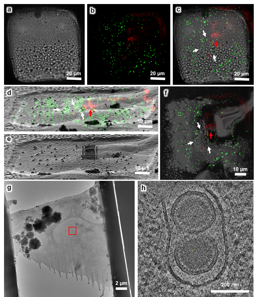 a.冷冻明场透射光图像;b.HOPE-SIM荧光图像的z投影。绿色,荧光微球。红色,MHV-68病毒;c将b中的荧光图像与a中的明场图像合并,以显示目标信号的位置;d.冷冻SIM和冷冻FIB图像之间的三维关联匹配;e.对目标区域减薄后的冷冻FIB图像;f.减薄后冷冻扫描电镜图像,与b中冷冻SIM图像的融合;g-f.制备的冷冻含水切片的冷冻透射电镜显微照片(3600倍);h.冷冻断层扫描成像,放大倍率为64000倍,显示了被捕获的病毒颗粒。