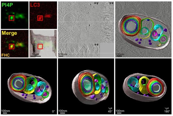 图.ELI TriScope荧光实时监控指导聚焦离子束精准靶向制备包含LC3阳性和PI4P阳性信号的冷冻含水切片,开展冷冻电子断层扫描成像及三维重构,可视化渲染展示KRAS(G12V) FHC细胞中LC3阳性和PI4P阳性区域冷冻原位高分辨三维结构。