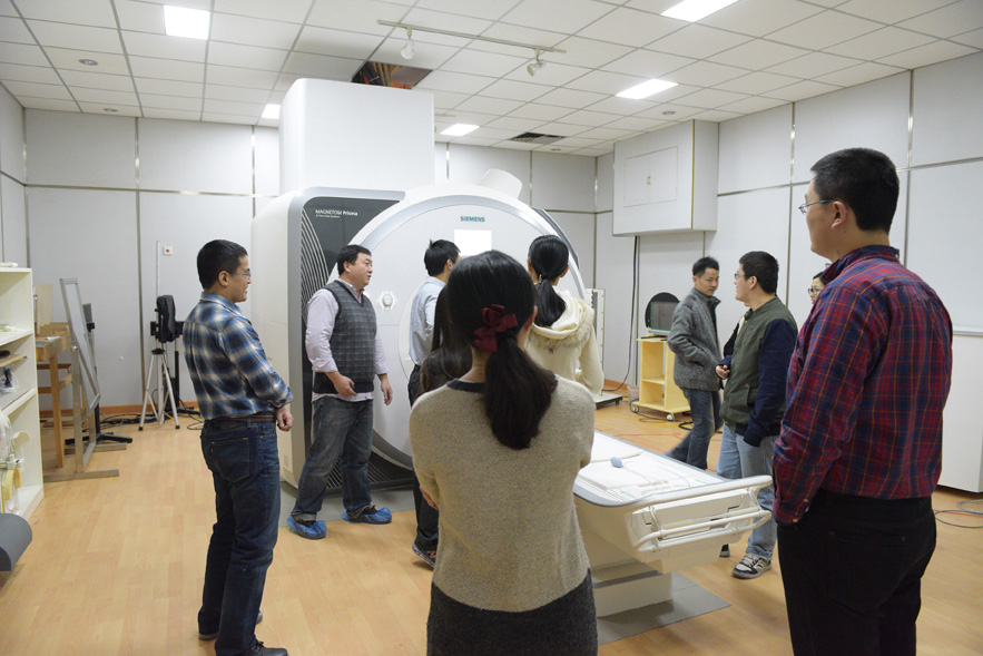 活动由生物物理所青促会组长潘磊研究员主持,他首先为大家介绍了生物物理所的学科布局、主要研究方向以及脑与认知国家重点实验室概况,并鼓励所内和所间成员广泛交流并建立有效合作。接着,王波博士做了题为“意识和知觉——大脑‘眼’中的物质世界”的科普报告。报告内容沿三个方向展开,分别为:意识形成的物质基础、视觉感知觉和意识、脑成像技术和设备。王波在报告中介绍到:”认知科学是研究人类的认知和智力本质和规律的科学。其研究范围包括知觉、注意、记忆、动作、语言、推理和思考,乃至意识在内的各个层次和方面的人类认知和智力活动。它是高度跨学科提出的,也是高度跨学科发展的。视觉感知觉和意识的研究是认知科学最活跃的领域;许多大型先进的脑成像设备皆成为视觉神经表达研究的不可或缺的工具。”报告中,王波博士旁征博引,穿插了很多鲜活的案例和有趣的图像资料,展现了认知科学的神奇瑰丽,引发了大家的热烈谈论,为进一步的交流合作奠定了基础。释疑环节后,大家又跟随王波博士来到了脑磁和核磁实验室,参观了脑磁仪、3T和7T核磁共振设备。为了加深大家对核磁共振成像原理的了解,部分参观者作为被试,亲身体验了核磁成像。其他成员对成像过程进行了观摩,对核磁图像产生的信息、用途乃至目前成像技术的瓶颈有了进一步的理解。