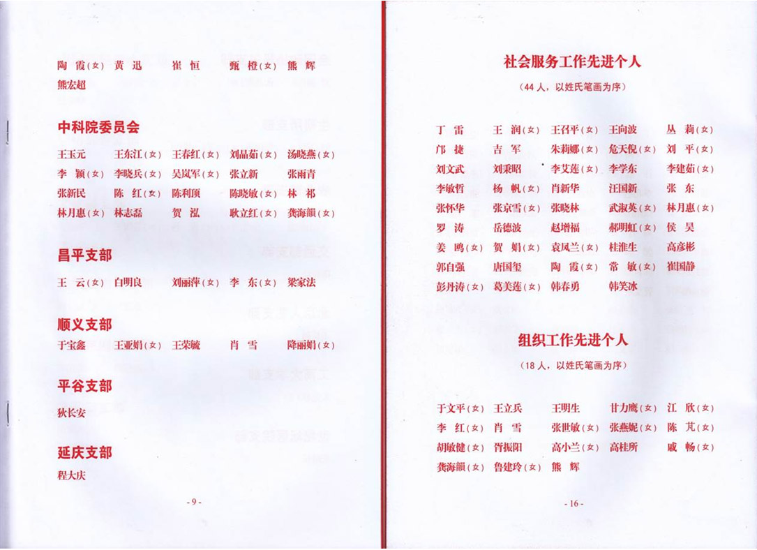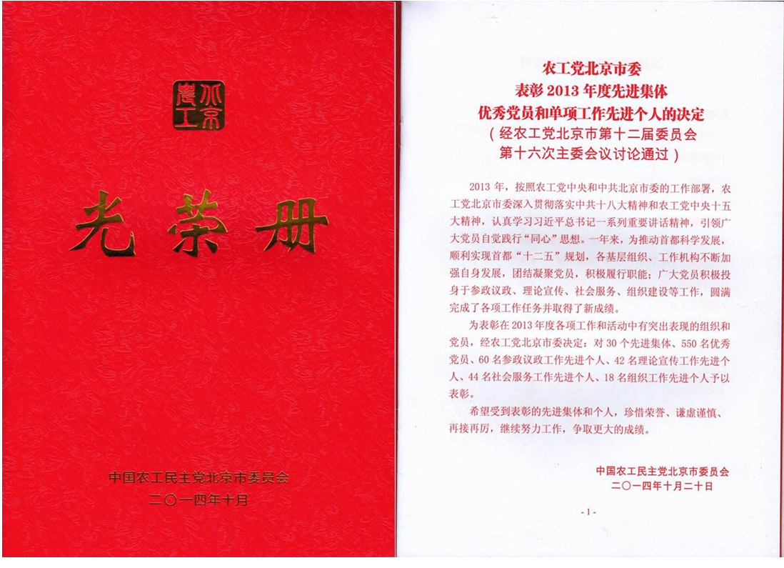 在2014年12月26日至27日,中国农工民主党北京市委会召开的第十二届委员会第四次全体(扩大)会议上,我所农工党员李颖,陈红,陈晓敏,龚海韻被评授予优秀党员荣誉称号,龚海韻被授予组织工作先进个人荣誉称号。