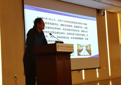 汪洪岩书记向与会同志通报了2018年度研究所党员领导班子民主生活会情况。解读上级组织关于召开2018年度民主生活会的工作要求,介绍了2月1日召开会议情况和群众意见办理的安排。