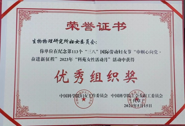 近日,金沙集团1862cc妇女工作委员会、金沙集团1862cc女职工委员会公布了"巾帼心向党·奋进新征程"2023年"科苑女性活动月"主题活动评选结果,生物物理所妇委会连续第三年荣获优秀组织奖。