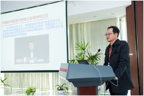 汪洪岩书记传达了院长、党组书记白春礼同志在中科院警示教育大会上的讲话精神。党的十八大以来,院党组以习近平总书记关于全面从严治党的重要论述为指引,坚决贯彻落实党中央全面从严治党战略部署,深入推进党风廉政建设和反腐败斗争,态度坚决,成效显著。我们也清醒地认识到,全院全面从严治党和党风廉政建设形势依然严峻,各级党组织和党员干部必须把思想统一到以习近平同志为核心的党中央的决策部署上来,认真学习贯彻习近平总书记关于全面从严治党的重要论述,坚持问题导向,切实提高政治站位,牢固树立“四个意识”,正视存在的问题,以违纪违法案件为警鉴,始终做到警钟长鸣,进一步增强推进全面从严治党和党风廉政建设的自觉性主动性,持之以恒正风肃纪。