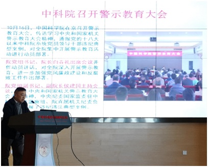 会上,纪委书记杨兴宪同志作了题为《不断强化遵章守纪的意识》的党课报告,传达中科院警示教育大会精神,通报党的十八大以来中科院系统党员领导干部违纪典型案例。杨兴宪指出,全所职工要从个人做起,从小事做起,持之以恒筑牢拒腐防变的“防火墙”,不断增强政治意识、提高政治免疫力,坚定不移推进党风廉政建设。
