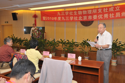 九三学社生物物理研究所支社成立暨2010年度九三学社北京市委优秀社员颁奖会议于2011年9月16日在生物物理研究所隆重召开。全国政协副主席、九三学社中央副主席、中科院院士王志珍研究员,九三学社中科院主委张钟宁研究员,生物物理研究所副书记、副所长龚为民研究员,生物物理研究所副所长赫荣乔研究员、原九三学社主委齐鸿雁研究员以及研究所党办负责同志和支社新老社员出席了会议。九三学社生物物理研究所支社主委范祖森研究员主持会议。