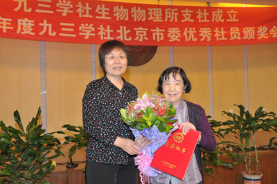 张钟宁主委首先宣布,九三学社生物物理研究所支社(科学院第九支社)正式成为独立支社,并宣读“院委员会对第九支社的选举结果及分工情况的批复”。他勉励大家,作为科研领域的“国家队”,能在国家科学技术方面多提建设性的意见和建议。同时积极培养年轻的优秀社员,为我国科学技术的发展作出突出贡献。接下来,在热烈的掌声中,张钟宁主委为王志珍院士颁发了“2010年创先争优活动突出贡献奖”,以表彰王志珍院士为九三学社所作的杰出贡献。原九三学社主委齐鸿雁研究员也为九三学社北京市2010年获奖的优秀社员进行颁奖。