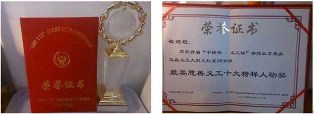 由北京市慈善义工协会、北京电视台、北京人民广播电台、千龙网联合主办的“中国梦·义工情——寻找北京最美慈善义工”大型文化系列活动自2012年12月26日正式启动以来,组委会历时一年多时间,以“中国梦·义工情”为主题,以广大一线慈善义工为参与对象,在“公平、公正、科学、全面”的原则下,通过七个阶段的工作和三次评选与公示,全部奖项已最终产生,并于2014年2月22日举行了颁奖大会。我所科学研究平台职工、资深志愿者、中国农工民主党党员崔娅姬同志获选为“北京最美慈善义工十大榜样人物”。