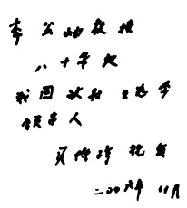图一、贝老为作者题词:“李公岫教授 八十华诞 我国放射生态学领导人 贝时璋祝贺 二○○六年11月”