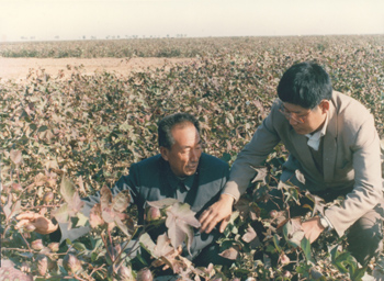 当时,由于受地理位置和宣传等原因影响,全作者在试验田中与当地农技人员观察棉花增产新技术实施情况国只知道“乐陵小枣”而不晓得“无棣金丝小枣”,只有打着“乐陵小枣”的名义才能卖出好价格。所以,金丝小枣并没有给无棣人民带来“黄金”效益。为此,无棣县政府向国家林业部申报了“国家沿海防护林基地县”并以此给“无棣金丝小枣”正名。我陪同县领导进京汇报,并专程拜访生物物理研究所。当时,年过九旬的贝老听完无棣县县长关于无棣枣树种植历史、现有规模以及枣树对该县生态环境以及经济发展的作用后,高度赞扬了无棣人民植树造林保护生态环境的做法,同时挥毫泼墨,欣然提笔书写:“中华金丝小枣第一县”的条幅赠送给无棣县,充分表达出老一辈科学家对无棣人民的敬意。
