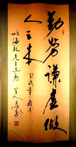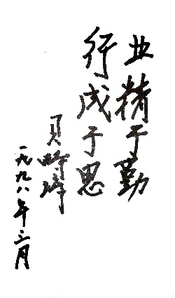 1994年岁末,已故著名相声演员马季先生来我单位做客,我有幸与其一起笑谈人生。当得知时年已是98岁高龄的资深老院士—贝先生还在孜孜不倦地战斗在科研一线时,马季先生深深地被贝老的勤劳和顽强精神所打动。临别时,他泼墨挥毫,送我“勤劳谦虚 做人之本”八个大字共勉。条幅字里行间充满了厚重的哲学底蕴,又洋溢着豪迈的人生自信,更对做人真谛起到“画龙点睛”的作用。