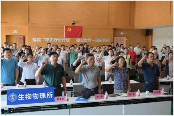 大会第一项是新党员入党宣誓和老党员重温誓词。全场党员举起右手,面向党旗郑重宣誓。每个共产党员都不应忘记自己的责任和使命,自觉遵守党的纪律,为国家科技创新事业认真工作,做一名合格的共产党员。通过重温入党誓词,进一步强化了党的观念,增强了党员意识。