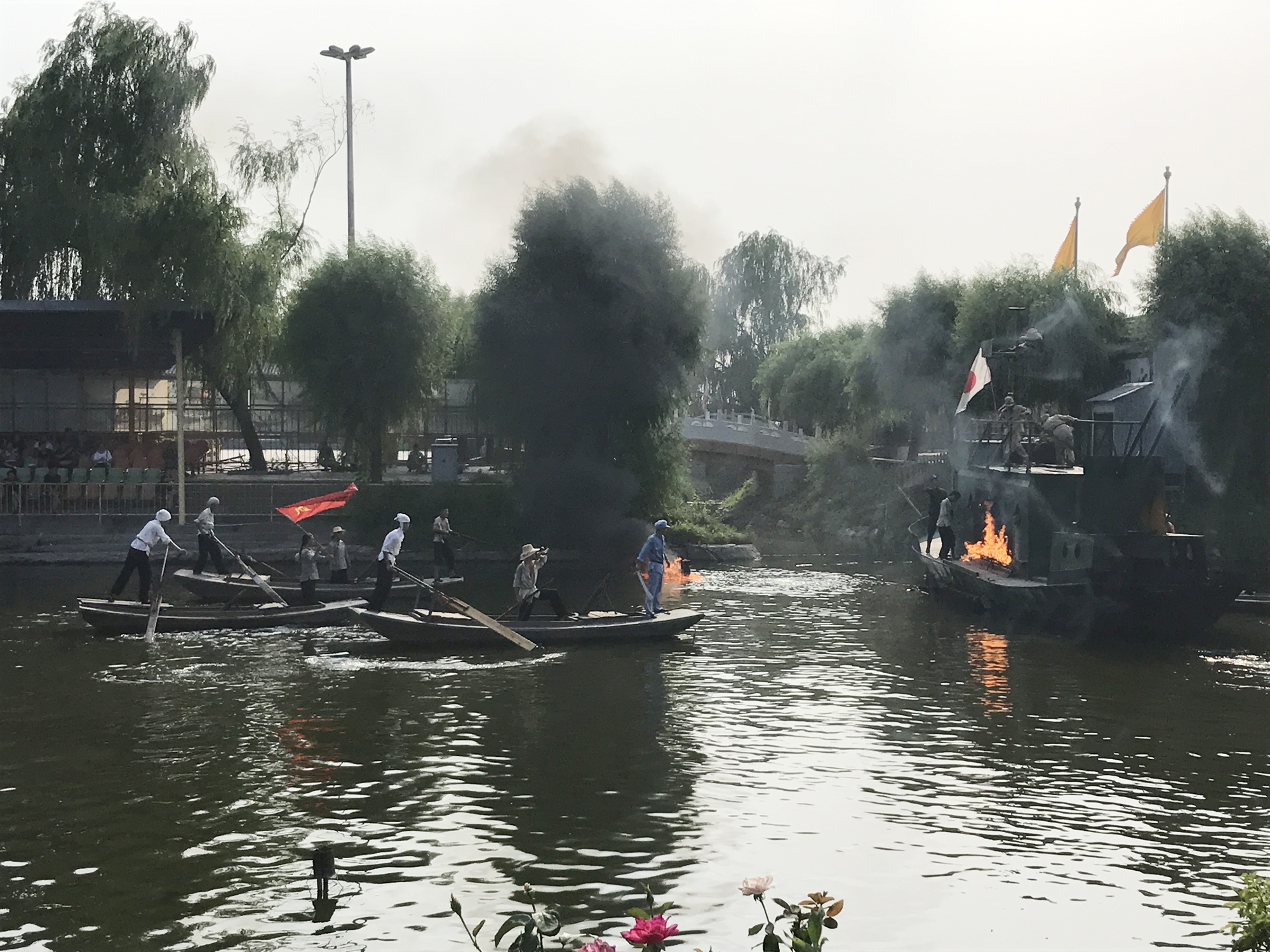 在白洋淀文化苑内的“雁翎队纪念馆”,党员代表观看了大量历史照片、实物和历史情景剧,回顾了昔日在党领导下活跃在白洋淀抗日武装雁翎队利用芦苇密布、沟河交错的复杂地形,组织抗日武装斗争、捍卫家园的光辉历史。“嘎子村”内,多副雕像展示了抗日小英雄嘎子的生动形象。