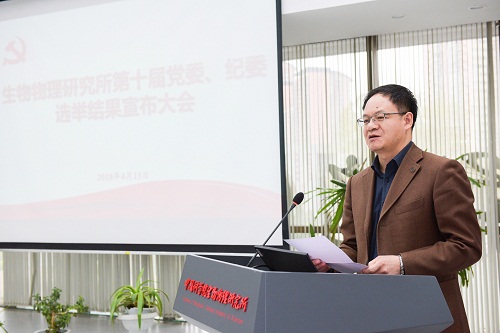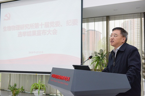 2018年4月13日上午,生物物理研究所召开党委纪委选举结果宣布大会。北京分院分党组书记马扬、干部人事处处长欧云,生物物理研究所领导班子成员许瑞明、汪洪岩、杨兴宪、刘力、朱冰出席,大会由马扬同志主持。
