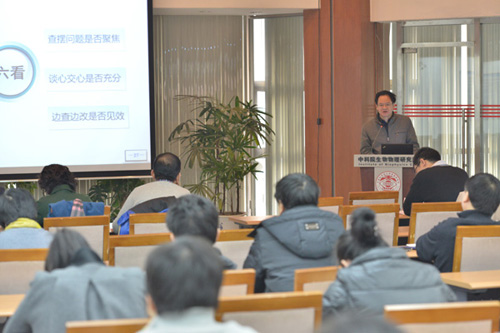 1月23日上午,生物物理所在图书馆报告厅召开党的群众路线教育实践活动总结会议。会议由副所长、党委副书记刘力同志主持。所领导班子成员、党委委员、纪委委员,党员中的副高以上科研骨干、副处级以上中层干部,各党总支、支部书记,在职支部副书记参加会议。京区教育实践活动第一督导组成员、北京分院副院长李静同志,京区党委组织员王大立同志,北京分院科技合作处赵珂杰同志到会指导。研究所中层干部、群众组织负责人中的党外人士及民主党派代表应邀出席了会议。