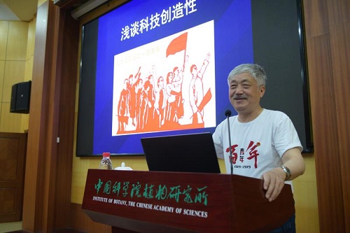 赫荣乔研究员为师生作了题为“纪念五四运动 浅谈科技创新”的主题报告。回顾了五四运动的革命创新精神,提出了“什么是创造性?”、“什么是世界上的最美?”等问题,穿插趣味故事,和团员探讨共享了自己的思考和理解。赫老师认为,个性的发挥与张扬是创造,最简即最美。他启发从事科研工作的年轻人,质疑是知识分子、科研工作者需要具备的要素,科学的最高境界是艺术。