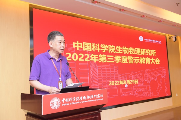 2022年9月29日,生物物理所组织召开2022年第三季度警示教育大会。纪委书记杨兴宪作专题廉政报告,党委书记刘力主持会议并作廉政讲话。