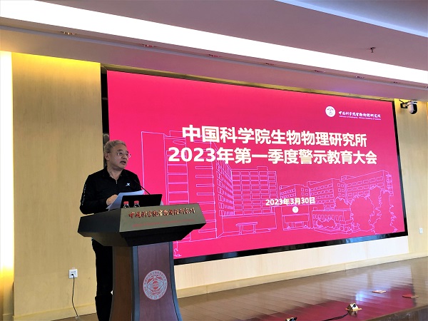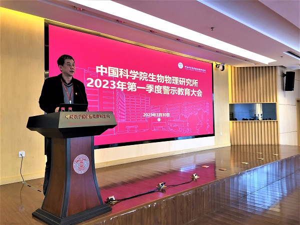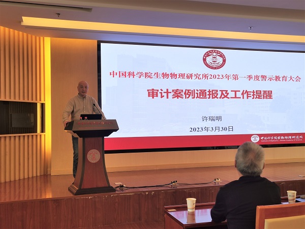 2023年3月30日,生物物理所组织召开2023年第一季度警示教育大会。所长许瑞明作审计案例通报及工作提醒专题报告,纪委书记杨兴宪作贯彻落实中央八项规定精神及院党组实施办法专题廉政报告,党委书记刘力主持会议并作廉政讲话。