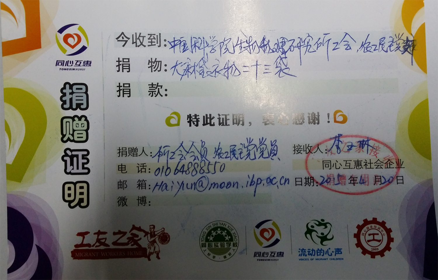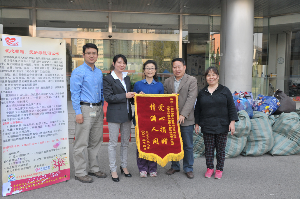 2015年4月20日,在中科院生物物理所工会和中科院农工委生物物理所农工党支部倡议下,“爱心捐赠、爱所绿植”的公益性活动顺利进行。记得去年的当下,也开展了这场活动,共收到捐赠衣物五千余件。而今年,大家的捐助积极性更高,捐助衣物达万余件,足足装了二十五麻袋。捐助的闲置物品最终由北京工友之家文化发展中心“同心互惠”公益组织派专车上门接收,所捐助的物品全部用于帮助在京务工者的公益事业中。