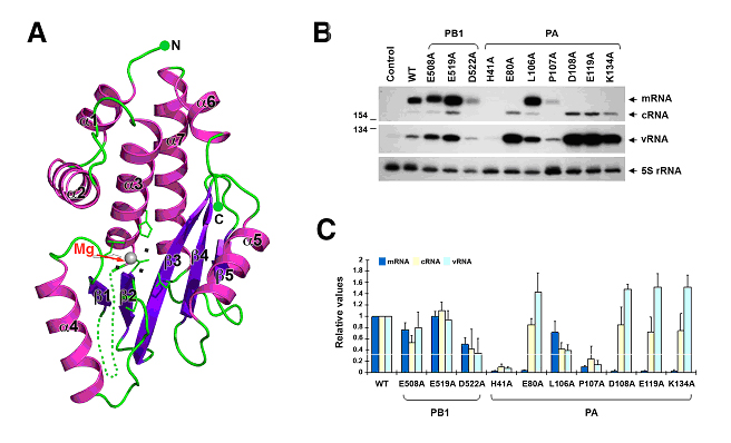 图片说明:禽流感病毒RNA聚合酶亚基PA氨基端结构与功能分析。(A)PA氨基端结构飘带图。其中镁离子(银色小球)以红字(Mg)标出;三个小黑点代表水分子。(B)与(C)PA亚基内切核酸酶活性鉴定及数据统计分析。