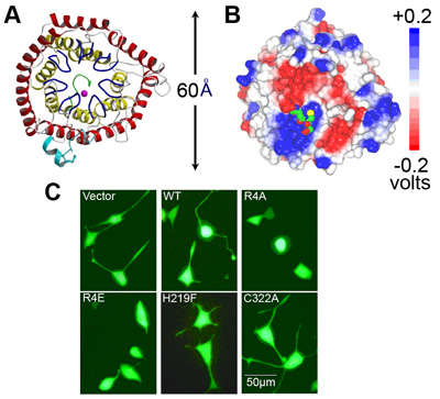 人源LanCL1 是一类功能研究较少的蛋白,与原核生物LanC (lanthionine cyclase)在序列上只有约15%的同源性。该实验室得到了人源LanCL1 以及其与谷胱甘肽复合物的三维晶体结构。通过对该结构的分析,他们发现该蛋白有可能是一个能直接耦合细胞氧化还原状态与生长因子受体通路信号转导的分子。进一步的突变实验和体外SPR(表面等离子体共振技术)等实验证实人源LanCL1 能特异性地结合生长因子信号传导相关的蛋白EPS8(生长因子受体底物蛋白8)上 的SH3 domain,并且这一相互作用受谷胱甘肽的调节。在此基础上,细胞实验也表明所有能减弱与EPS8相互作用的突变体均能抑制神经细胞PC12的分化。这一研究结果不仅为深入研究LanCL1的功能指明了研究方向,而且还为研究影响神经细胞分化的信号传导通路开启了一个新的研究领域。
