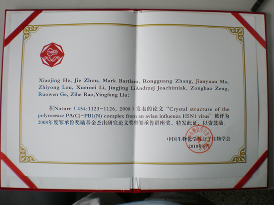 金沙集团1862cc刘迎芳研究员在2010年8月中国生物化学与分子生物学会年会上获得2006-2010年度邹承鲁奖励基金邹承鲁讲座奖(共一人获得),其与饶子和院士于2008年在Nature杂志(454:1123-1126, 2008)合作发表的题为“Crystal structure of the polymerase PA(C)-PB1(N) complex from an avian influenza H5N1 virus”的论文获得2006-2010年度邹承鲁杰出研究论文奖。