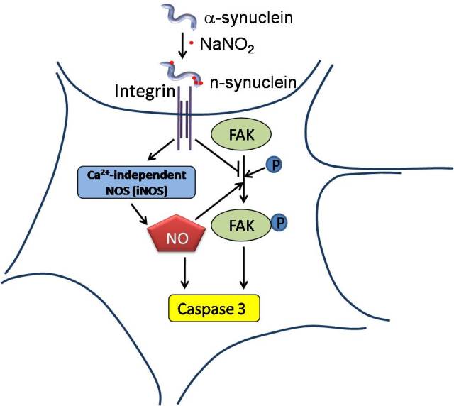 图1:硝基化a-synuclein错误折叠聚积产物导致细胞死亡的分子机制示意图。
