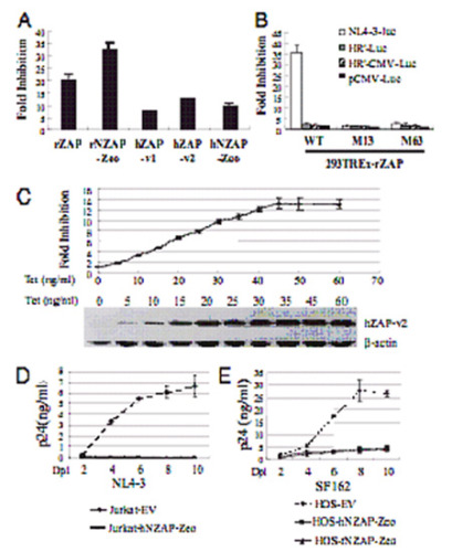图:ZAP抑制HIV-1病毒的复制。A:不同种属ZAP对HIV-1报告病毒的抑制;B:ZAP突变体丧失抗HIV-1作用;C:ZAP的抗病毒活性与ZAP蛋白表达水平成正相关;D,E:ZAP对HIV-1毒株NL4-3和SF162复制的抑制。