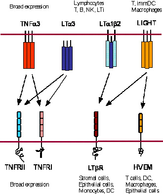 图1:TNF核心家族分子之间复杂的相互作用