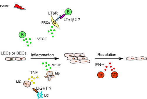 图2:在淋巴结重塑变化中,多种免疫细胞和免疫分子参与了不同阶段淋巴管内皮细胞和血管内皮细胞的功能和数量调节。
