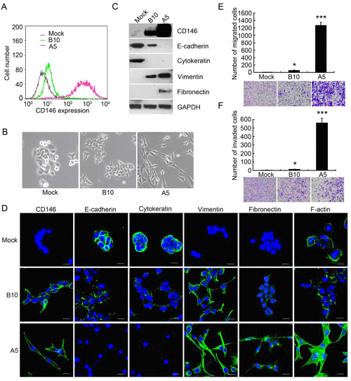 图表说明,CD146分子在上皮性质的乳腺癌细胞中过表达导致细胞发生EMT。