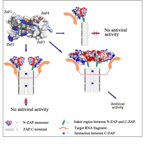 通过对ZAP蛋白活性区域的晶体结构测定工作,我们首次揭示了一种同时含有四个CCCH类型锌指结构的蛋白质分子三维结构,为ZAP蛋白特异识别病毒RNA分子并发挥其抗病毒活性提供了准确的结构基础;通过一系列体内抗病毒实验以及体外与病毒RNA的结合实验对ZAP蛋白N端结构域重要的RNA结合位点进行了验证,发现了ZAP蛋白表面含有一个由四个锌指结构构成的面积约300平方埃的、三维的特异性结合病毒RNA的区域;通过实验发现并证实了ZAP蛋白分子氨基端存在分子间相互作用,这种相互作用会促使ZAP蛋白在体内抗病毒过程中以二体形式识别并结合病毒RNA,这对抗病毒活性中起决定作用。同时,我们发现ZAP能够识别并抑制的RNA不仅可能存在特殊的高级结构,而且还含有两个ZAP结合区域,这就解释了为什么ZAP靶RNA都非常大。