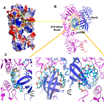 图解:(A) TTERecOR的表面电势图. (B) TTERecR 二体的N-端结合区与RecO N端1-23 位氨基酸组成的肽链相互作用形成疏水通道. (C) ssDNA 穿过TTERecOR 的疏水结合通道.