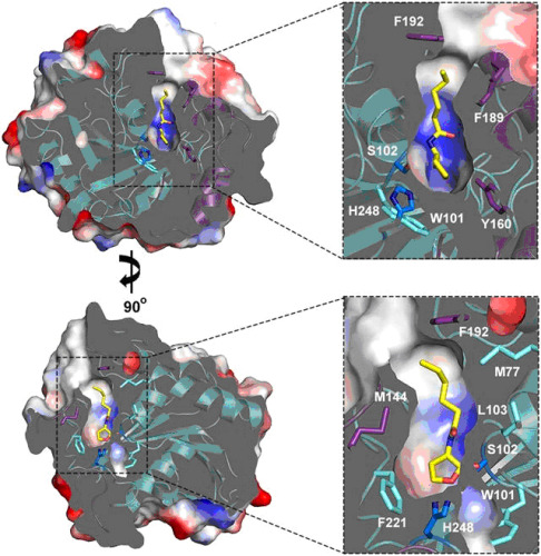 图示: AidH的底物结合通道位于核心结构域(灰色)和“盖子”结构域(青色)之间,被若干疏水残基环抱,长约14?,几乎全部呈现正电荷(蓝色表示正电荷)。底物C6-HSL分子的头部内酯环通过氢键结合于催化反应的活性中心,酰胺链尾部伸向通道的入口处。