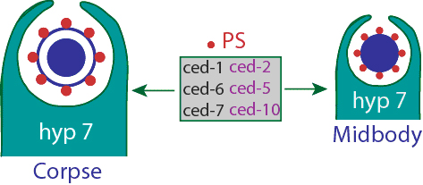 欧光朔研究组以线虫Q神经前体细胞发育产生的中间体为模型,发现中间体在细胞分裂后被释放到细胞外,继而被吞噬细胞所吞噬降解。在此过程中,参与凋亡细胞吞噬的细胞凋亡基因(ced-1和ced-2两条通路)是中间体被吞噬所必需的。磷脂酰丝氨酸(Phosphatidylserine)存在于中间体表面,作为中间体与吞噬细胞之间的识别信号。这个发现揭示了中间体在细胞分裂后的命运,拓展了对于细胞凋亡基因和磷脂酰丝氨酸信号在细胞凋亡以外功能的认识。