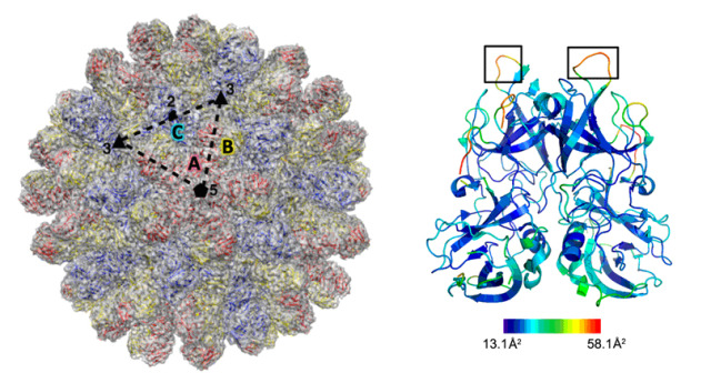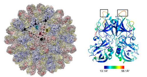 图示: (左)RHDV衣壳准原子模型与低温电镜密度图的匹配、及(右)RHDV衣壳蛋白P结构域的关键抗原表位(黑色矩形标出的loop区)
