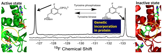 2013年 2月28日,Angewandte Chemie International Edition在线发表了王江云研究组,龚为民研究组及中国科技大学田长麟研究组合作题为“A Genetically Encoded 19F NMR Sensor for Tyrosine Phosphorylation”的最新研究成果。该研究通过基因密码子扩展,实现在原核及真核酪氨酸激酶活性中心编码氟代酪氨酸,利用19F核磁(NMR)研究酪氨酸激酶活性中心的构象变化,这为基于酪氨酸激酶活性中心构象进行抗肿瘤药物的筛选提供了有力的工具。