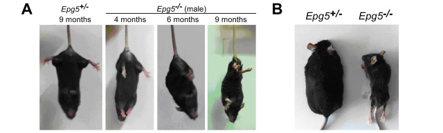 图说:A. Epg5-/-雄鼠随年龄增长逐渐出现后肢交叉反应。B. 10月龄时,Epg5-/-雄鼠出现后肢完全瘫痪。