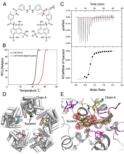 负链RNA病毒核蛋白(nucleocapsid protein,N)对病毒的转录复制至关重要。本研究首次解析了中国自主发现并鉴定的病毒SFTSV核蛋白及同源病毒Buenaventura (BUE)病毒和Granada (GRA)病毒核蛋白晶体结构,发现白蛉病毒属核蛋白包含一个紧密的C-端核心结构域和一个介导核蛋白多聚化的N-端延伸手臂。白蛉病毒属核蛋白具有保守的构架和类似的RNA衣壳化机制。为进一步筛选潜在的核蛋白抑制剂,我们采用高通量筛选方法发现苏拉明(Suramin)能非常紧密且特异性地与白蛉病毒属核蛋白结合,同时解析了SFTSV核蛋白与Suramin复合物的高分辨率晶体结构。苏拉明(Suramin,又称309 F,309 Fourneau,Bayer 205,Moranyl,Naganin,Naganine等)是由德国Oskar Dressel和Richard Kothe于1916年发明的,目前仍以“Germanin”的商标名在销售。Suramin主要用于治疗锥体虫引起的人类嗜睡病和盘尾丝虫病。另外,Suramin也可以用于治疗前列腺癌。目前未见Suramin及其类似物用于治疗SFTSV等白蛉病毒属病毒疾病的报道。