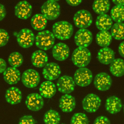 图示:线虫未成熟精子细胞内锌离子的分布。绿色荧光显示囊泡内自由态锌离子,红色荧光指示线粒体。 精子细胞直径为5微米。