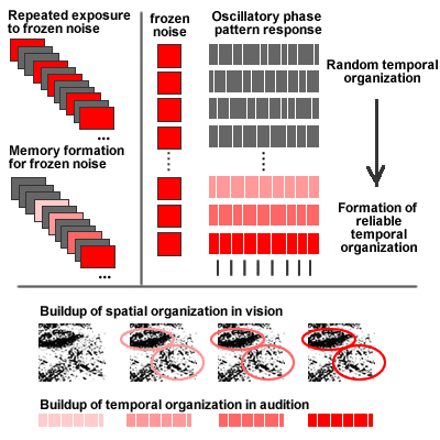 图示:随着对白噪声记忆的建立,大脑逐渐产生稳定的时间分割反映模式,即时间组织上的稳定化,类似于视觉学习中空间组织的建立。