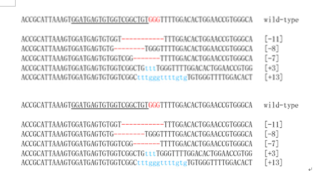 图二、野生型yellow基因与用CRISPR/Cas9制备的各种突变的序列比较