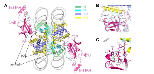 图注:A) N端乙酰化的Sir3BAH与酵母NCP复合体的晶体结构示意图;B) ac-Sir3BAH-yNCP与Sir3BAH-xNCP结构比对图,可见N末端Ala2残基及Loop3部位的差别;C) Nα乙酰化修饰的Ala2残基折回了Sir3本身的疏水口袋,并通过相互作用稳定了Loop3。