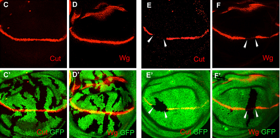 图一、dCAF-1-p105体细胞克隆内(GFP阴性处,E’和F’中,C’和D’模拟对照克隆)Cut和Wg表达被下调