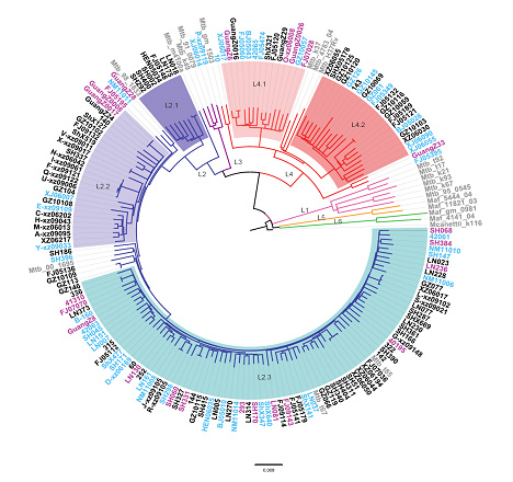 图示:从中国12个省份中收集的161结核分枝杆菌的进化分析图。其中,灰色菌株名代表以前公布过的结核分枝杆菌株,蓝色菌株名代表敏感结核分枝杆菌株,黑色菌株名代表多耐药(MDR)结核分枝杆菌株,粉红色菌株名代表广泛耐药(XDR)结核分枝杆菌株。